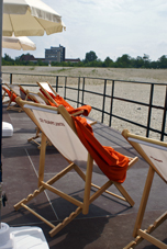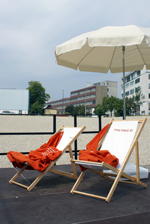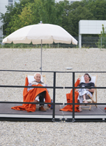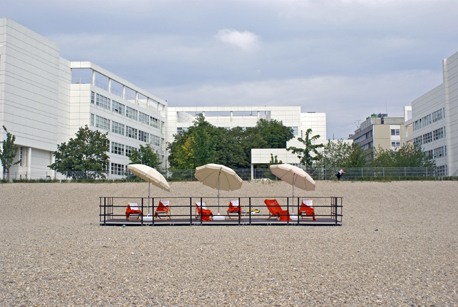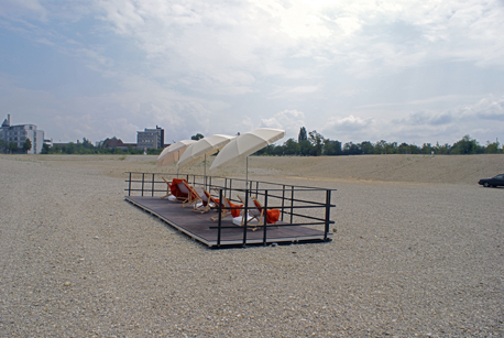 oder wird es globaler? Eine Bühne - ein Sonnendeck, eine Sonnenterasse - steht in einer Kiesgrube in Sendling, München. Darauf sieben Liegestühle. Auf den Liegestühlen sind Namen und eine Zahl gestickt, z.B. Helmut 66. Der Name auf den Liegeflächen gibt den Namen und das Alter der Person wider, mit der das Gespräch geführt wurde. Die Kombination erinnert an Chatnamen in Internetcommunities. Zu jedem Stuhl gehört eine Decke. Auf den Decken sind Ausschnitte aus Gesprächen mit alten Menschen gestickt. Während für den Einen das Warten überhaupt keine Rolle zu spielen scheint, ist es für den Anderen existentiell. Die Installation lädt den Besucher ein, Platz zu nehmen, sich mit der Situation zu umgeben und den Blick Richtung Alpen zu richten. Bitte nehmen Sie Platz mit Blick auf die Alpen! | |||||